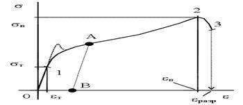 На рис.15 изображена типичная зависимость механического напряжения от относительного удлинения при растяжении образца. Кривая имеет 3 характерных участка. Участок 0-1 соответствует упругим обратимым деформациям, когда выполняется закон Гука. Участок 1-2 соответствует необратимым пластическим деформациям. Участок 2-3 соответствует разрушению образца.