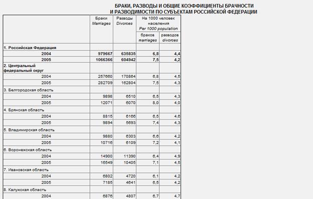 Согласно данным Росстата, число браков в РФ в 2005 году составило 1 066 366, в 2006-м – 1 113 562, число же разводов: в 2005-м – 604 942, в 2006-м – 640 837. Соответственно, естественный прирост населения в России превратился в естественную его убыль и составил -846 559 чел. за 2005 год и -687 066 чел. за 2006 год. На 2009 год зарегистрировано около 1200 тыс. браков и 700 тыс. разводов.