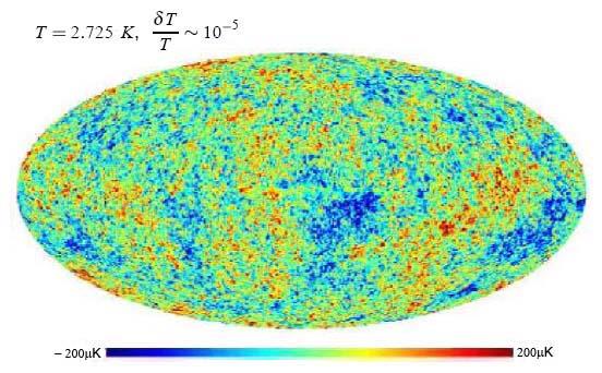 (0,01%) от средних значений. Тем не менее, эти вариации существовали: с разных направлений электромагнитное излучение приходит с несколько различной температурой. Это показано на рис. 3, где изображено распределение температуры по небесной сфере (фотоснимок ранней Вселенной) за вычетом средней температуры 2,725 градусов Кельвина; более холодные области показаны синим, более теплые — красным цветом