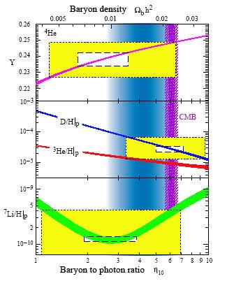 : линии представляют собой результаты теоретического расчета в зависимости от единственного параметра — плотности обычного вещества (барионов), а прямоугольники — наблюдательные данные. Замечательно, что имеется согласие для всех трех легких ядер (гелия-4, дейтерия и лития-7); согласие есть и с данными по реликтовому излучению (показаны вертикальной полосой на рис. 4, обозначенной СМВ — Cosmic Microwave Background). Это согласие свидетельствует о том, что общая теория относительности и известные законы ядерной физики правильно описывают Вселенную в возрасте 1–200 секунд, когда вещество в ней имело температуру миллиард градусов и выше. Для нас важно, что все эти данные приводят к выводу о том, что плотность массы обычного вещества в современной Вселенной составляет