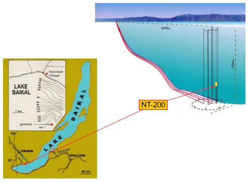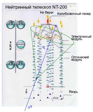 Наконец, еще один путь связан с регистрацией продуктов аннигиляции частиц темной материи между собой. Эти частицы должны скапливаться в центре Земли и в центре Солнца (вещество для них практически прозрачно, и они способны проваливаться внутрь Земли или Солнца). Там они аннигилируют друг с другом, и при этом образуются другие частицы, в том числе нейтрино. Эти нейтрино свободно проходят сквозь толщу Земли или Солнца, и могут быть зарегистрированы специальными установками — нейтринными телескопами. Один из таких нейтринных телескопов расположен в глубине озера Байкал (НТ-200, рис. 8