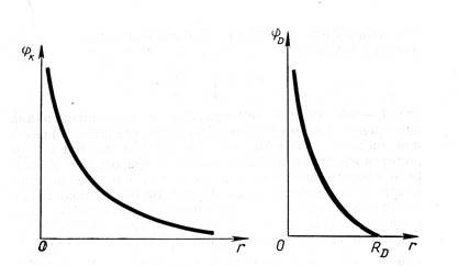 Кулоновское электрическое поле существует, как известно, во всем пространстве вокруг заряда (рис. 1); оно исчезает только на бесконечно большом расстоянии от заряда. Если же рассмотреть поле того же заряда в плазме, т.е. в совокупности большого числа разноименно заряженных частиц, то получается иная картина: поле данного заряда не простирается до бесконечности, а обрывается (как говорят физики, экранируется), начиная с некоторого расстояния (рис. 2). Это расстояние RD
