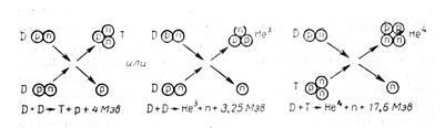 Известно, что ядро атома водорода представляет собой протон р. Такого водорода очень много в природе— в воздухе, в воде. Кроме этого, существуют более тяжелые изотопы водорода. Ядро одного из них содержит, кроме протона р, еще и нейтрон n. Называется этот изотоп дейтерием D. Ядро другого изотопа содержит, кроме протона р, еще и два нейтрона n и называется тритием Т. На рисунке 15 представлены схемы реакции синтеза этих ядер. В реакции синтеза выделяется энергия, которая в расчете на 1 кг вещества значительно больше энергии, выделяющейся в реакции деления урана.