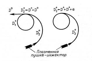 Рассмотрим теперь второй путь. Это метод инжекции быстрых частиц. Задача введения быстрых частиц внутрь сильного магнитного поля и удержания их там связана с определенными трудностями. Ведь любая заряженная частица, попав в постоянное магнитное поле и двигаясь перпендикулярно линиям индукции, делает в поле полный оборот и возвращается в исходную точку, если не изменить ее траектории внутри магнитного поля. Один из способов изменения траектории инжектируемой частицы внутри ловушки основан на диссоциации молекулярных ионов. Если однократно ионизованные молекулы например дейтерия, попадают в ловушку, то они могут диссоциировать на атомах остаточного газа. При этом молекулярный ион дейтерия превращается в атомарный ион дейтерия и нейтральный атом дейтерия или в два атомарных иона и один электрон: