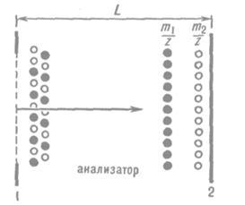 У час-пролітному мас-спектрометрі (мал. 5) іони утворяться в іонному джерелі дуже коротким електричним імпульсом й «впорскуються» у вигляді «іонного пакета» через сітку 1 в аналізатор 2, що представляє собою еквіпотенціальний простір. «Дрейфуючи» уздовж аналізатора в напрямку до колектора іонів 3, вихідний пакет «розшаровується» на ряд пакетів, кожний з яких складається з іонів з однаковими m/е. Розшарування обумовлене тим, що у вихідному пакеті енергія всіх іонів однакова, а їхньої швидкості й, отже, часи прольоту t аналізатора обернено пропорційні :