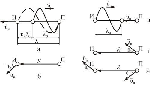1) Пусть приемник звуковых волн П в газообразной (или жидкой) среде неподвижен относительно нее, а источник И удаляется от приемника со скоростью вдоль соединяющей их прямой (рис.2, а