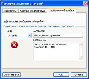 Для обработки допущенных ошибок воспользуемся закладкой "Сообщение об ошибке". При выборе в поле "Вид" соответствующего сообщения: "Останов", "Предупреждение", "Сообщение" рис.4,5,6 соответственно, на экран выводится сообщение об ошибке или запрете ввода неверных данных (рис.7,8,9).