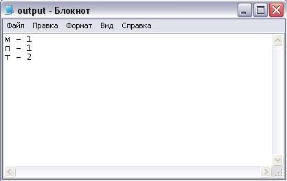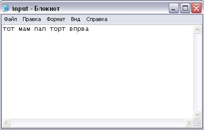 При вводе строки «тот мам пап торт впрва » (рисунок 5) в текстовый файл input.txt будет получен следующий результат: м – 1, п – 1, т – 2 (рисунок 6).