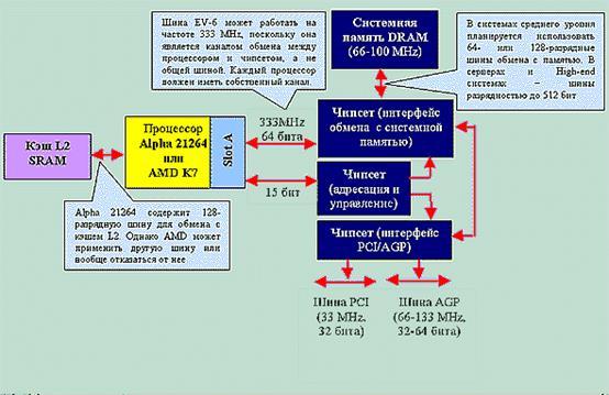 Возникает резонный вопрос: как удалось заставить EV-6 работать на такой частоте, если переход даже с 66 MHz на 100MHz сопряжен с громадными техническими сложностями. Дело в том, что EV-6, в общем-то, не является шиной в привычном понимании этого слова. На системной шине Socket 7 "висит" собственно процессор (или процессоры в многопроцессорных системах), кэш L2, системная память, шина PCI и, если она присутствует в системе, шина AGP. Архитектура Р6 отличается только тем, что с системной шины "сняли" кэш L2, выделив для него специальную 64-разрядную шину. EV-6 же представляет собой просто 64-битный канал обмена между процессором и чипсетом. Каждый процессор в многопроцессорной системе должен иметь свою шину EV-6. Обмен с системной памятью, PCI и AGP осуществляется чипсетом, причем каждая шина может работать на своей частоте.