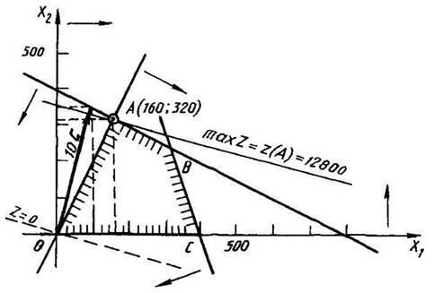 Решая совместно уравнения граничных прямых АВ и ОА, находим координаты точки А: =160, =320. При этом = maxZ = z (A) =12800.