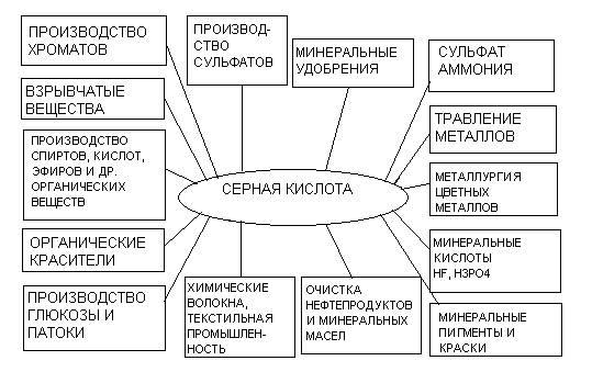 С) находится в жидком состоянии. Она широко используется в производстве минеральных удобрений, различных солей и кислот, всевозможных органических продуктов, красителей, дымообразующих и взрывчатых веществ и т.д. Серная кислота находит разнообразное применение в нефтяной, металлургической, металлообрабатывающей, текстильной, кожевенной и других отраслях промышленности, используется в качестве водоотталкивающего и осушающего средства, применяется в процессах нейтрализации, травления и т.д. Наиболее важные области применения серной кислоты отражены на схеме.