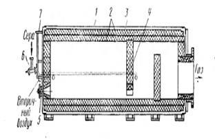 Рис. 5.1. Печь для сжигания жидкой серы и распыленном состоянии (форсуночная печь): 1 - стальной цилиндр, 2- футеровка, 3 - асбест, 4 – перегородки, 5 - форсунка для распыленны топлива, 6-форсунки для распыления серы, 7- короб для подвода воздуха в печь