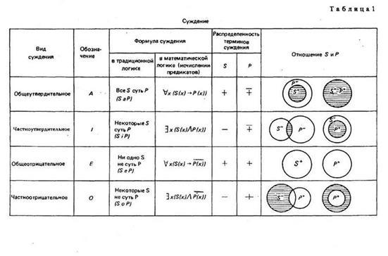 Распределенность терминов в категорических суждениях можно выразить в виде следующей схемы (табл. 1), где знаком (+) выражена распределенность термина, а знаком (-) его нераспределенность. В ней же дана объединенная информация о простых суждениях.