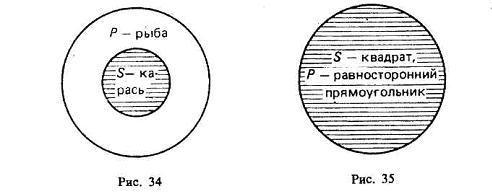 Распределенность терминов в суждениях можно иллюстрировать с помощью круговых схем Эйлера. На рис. 34 изображено соотношение S
