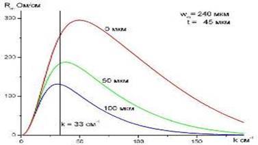 На рис. 2 и 3 представлены зависимости и от , которые были теоретически рассчитаны в случае внешнего, перпендикулярного плоскости пленки, магнитного поля Hподм = 5000 Е в предположении, что ЖИГ пленка связана с микрополосками, имеющими различную ширину wm (60, 120 и 240 мкм), изготовленными на коммерческой поликоровой подложке толщиной 254 мкм в микрополосковой линии с одной заземленной плоскостью. Очевидно, что чем больше значение ширины микрополоска wm и более селективная характеристика фильтра, тем меньше максимальное значении . С другой стороны, узкие микрополоски могут быть предпочтительны, если необходима очень сильная связь ПР с ними. Ширина микрополоска wm = 240 мкм – предельный случай, соответствующий пятидесятиомной согласованной микрополосковой линии. Вертикальная линия, изображенная на рисунках, соответствует возбуждаемому значению волнового числа k в резонаторе при ФМР. В частности если возбуждаемое волновое число близко к значению при максимуме кривой Rm, но немного ниже, имеется незначительное изменение сопротивления ПР.