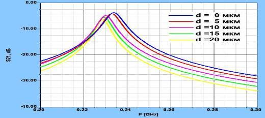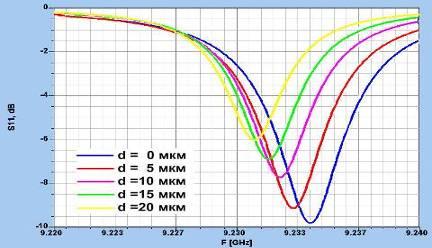 На рис. 4 показано, что улучшение в селективности фильтра можно получить с помощью диэлектрической прокладки, распложенной между поверхностью пленки и микрополосками. В том случае существенное уменьшение Rm наблюдается из-за уменьшения связи, вызванного зазором. Так как полное электрическое сопротивление R ПР пропорционально Rm и ширине пленки ly, размеры ПР должны быть скорректированы так, чтобы избежать докритической связи, когда используется зазор.