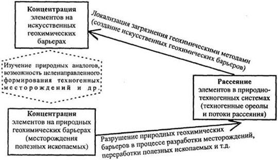 , на которых формируются концентрации элементов. Разработка месторождений и переработка полезных ископаемых, приводит к разрушению этих барьеров. Негативным следствием этого процесса, является неконтролируемая миграция элементов или загрязнение окружающей среды. В районах расположения источников загрязнения формируются техногенные ореолы и потоки рассеяния.