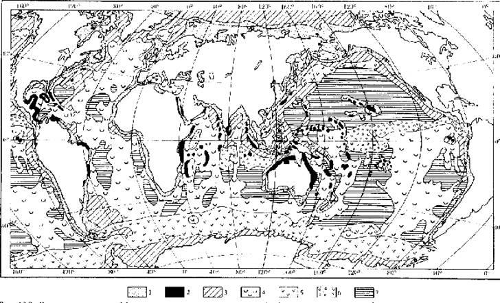 вулконогенные), а также айсберговые отложения, 4-фораминиферовые и другие карбонатные пелагические отложения, 5-диатомовые отложения, 6-радиорялевые