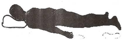 1. И. п. — лежа на животе, стопы на носках, руки вдоль туловища. Соединить лопатки, затем вернуться в исходное положение. Повторить 10—20 раз. Темп медленный. Дыхание свободное. 2. И. п. — то же. Согнуть ноги в коленных суставах, затем максимально выпрямить (рис. ). Повторить 10 раз. Темп средний. Дыхание свободное. Пауза отдыха 30— 3. И. п. — то же. Поднять надплечья и опустить. Повторить 10—20 раз. Темп медленный. Дыхание свободное. 4. И. п. — то же. Поднять прямые руки вверх, отвести назад — вдох, опустить — выдох. Повторить 3 раза. Темп медленный. 5. И. п. — то же. Поочередно сгибать ноги в коленных суставах. Повторить 10 раз каждой ногой. Темп средний. Дыхание свободное. 6. И. п. — то же. Поочередно поднимать и опускать прямые ноги, носки на себя. Повторить 6—10 раз каждой ногой. Темп медленный. Дыхание свободное. 7. И. п. — то же, руки согнуты в локтях, опираются на предплечья и кисти. Поднять голову вверх — вдох, опустить — выдох. Повторить 4 раза. Темп медленный. 8. И. п. — то же, правая нога согнута в колене, стопы на себя. Поднять правую ногу и, возвращаясь в исходное положение, одновременно поднять левую, затем наоборот, переходя на быстрый темп («бег»). Повторить 10—30 раз. Дыхание свободное. 9. И. п. — то же, ноги выпрямлены. Поднять ноги, не сгибая их (носки на себя), максимально прогнуться в пояснице и вернуться в исходное положение. Повторить 4—6 раз. Темп медленный. Дыхание свободное. 10. И. п. — то же, руки, согнутые в локтях, прижаты к туловищу. Поднять локти — вдох, опустить — выдох. Повторить 3—4 раза. Темп медленный. 11. И. п. — то же. Одновременно поднять голову, верхнюю часть туловища, согнутые в локтях руки, ноги, максимально прогнуться в пояснице, вернуться в исходное положение. Повторить 4—6 раз. Темп медленный. Дыхание свободное.