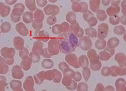 Цитоплазма содержит большое количество круглых базофильных гранул фиолетово-вишнёвого цвета, сквозь них просматривается ядро. У базофилов ядро обычно имеет слабодольчатую структуру, но разглядеть последнюю не всегда удаётся.