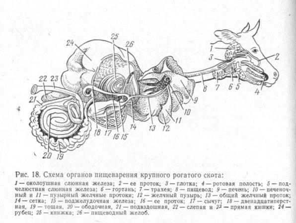 Околоушные железы лежат под кожей у основания ушной раковины. Выводные протоки этих желез открываются в защечное пространство. Подчелюстные слюнные железы находятся в межчелюстном пространстве ниже околоушной железы. Проток железы открывается на дне ротовой полости в подъязычной бородавке. Подъязычные слюнные железы лежат в подъязычной складке слизистой оболочки дна ротовой полости, сбоку от языка. У рогатого скота и свиней эта железа состоит из двух частей - коротко- и длиннопротоковой. У лошади имеется только короткопротоковая железа. Выводной проток у длиннопротоковой железы открывается вместе с протоком подчелюстной железы, у короткопротоко-вой - по ходу железы.