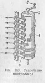 Поворотный контактор (рис. 164, а) состоит из электромагнита 1, якоря 7, расположенного на оси 6, главных контактов 2 и зажимов 3 и 4 для присоединения проводов электросети. Все части контактора укреплены на панели 8.