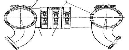При установке в коллекторы экранирующих труб выступающие кромки патрубков коллекторов запиливают. Особенно тщательно крепят экранирующие трубы 3, 12 и 13, направляющие патрубков 1 и 14 перепускной трубы Чтобы обеспечить герметичность стыков между коллекторами первой и второй групп цилиндров, при сборке, предварительно смазав поверхности стыка и прокладку 6 клеем ГЭН-150В, плотно обжимают стык коллекторов и затягивают на шпильках гайки до отказа.