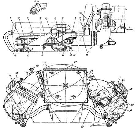 Выпускной коллектор второй группы цилиндров имеет экранирующую трубу 3, направляющий патрубок 1 и патрубок 5, перепускающий отработавшие газы в верхний канал коллектора первой группы цилиндров. два газовых канала, экранированных жаропрочными трубами 12 и 13. Со стороны коллектора второй группы цилиндров газовый канал 1-, 2-, 3-го цилиндров закрыт направляющим патрубком 14. Для компенсации теплового расширения впускной системы и обеспечения уплотнения газовых каналов в месте соединения нижнего колена с верхним стоят четыре уплотнительных кольца 27. Снаружи соединение закрыто дюритовым шлангом 24 с двумя хомутами 25. Перепускные стаканы 28 уменьшают перетекание газа между каналами.