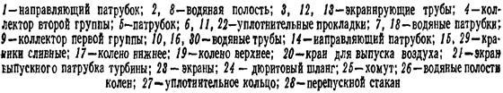 Выходящая из головки моноблока вода по трубе 16 поступает в водяную-полость коллектора второй группы цилиндров 4, откуда по двум перепускным патрубкам 7 в водяную полость коллектора первой группы цилиндров 9, а затем по трубе 10 в водяную полость верхнего колена 26. Из верхнего колена в нижнее вода поступает по патрубкам 18 и отводится из нижнего колена по трубе 30 в средний корпус газовой турбины. Из выпускной системы она сливается через сливные краники 29, а воздух при заполнении системы водой выпускается через кран 20. На неохлаждаемые патрубки турбины установлены экраны 23 для предохранения дюритовых шлангов выпускных колен от воздействия высокой температуры.