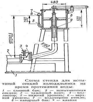 Промытые секции продуть сжатым воздухом, тщательно осмотреть и проверить качество промывки на специальном стенде. Время стекания воды от верхнего до нижнего уровня по рискам на водомерном стекле не должно превышать 43 с. Если за указанное время вода из секции не стечет, то ее следует очистить и промыть вторично. При этом водяные секции заполнить 5-процентным раствором соляной кислоты, нагретым до температуры 60° С. Для уменьшения действия кислоты на металл к раствору следует добавить 5% столярного клея от общего весового количества введенной в раствор соляной кислоты. После прекращения вспенивания, но не более чем. через 15 мин с момента начала заливки раствора в водяные секции вылить раствор и тщательно промыть секции сначала горячей (температура 70° С), а затем холодной водой. После этого необходимо просушить секции, продувая через них сухой сжатый воздух.