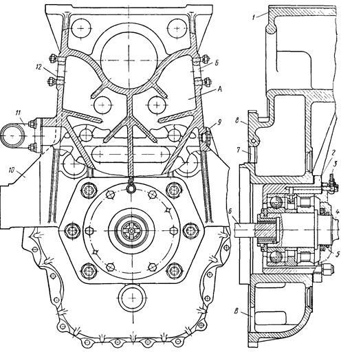 В верхней части кронштейна замкнутые полости А сообщаются отверстием 7 с картером дизеля. Полости А через отверстия Б подсоединены к трубам отсоса газов из картера. Кронштейн сбоку имеет фланец со шпильками для установки патрубка 11 слива масла из турбокомпрессора в нижнюю часть и далее по отверстию Б в нижний картер дизеля. Отверстие 9 с другой стороны кронштейна служит для замера давления в картере дизеля.