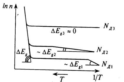 Відповідно до виразу (2.1) електричний опір матеріалу пов'язаний з концентрацією вільних носіїв заряду. Експериментальні і теоретичні розробки показують, що залежність концентрації носіїв заряду від температури практично у всіх легованих напівпровідників має вигляд, приведений на рис. 2.1. Характерними є три ділянки на поданій залежності. Низькотемпературна область, де відбувається виснаження домішки, і провідність визначається фізичними процесами взаємодії домішки з кристалічною граткою. Область виснаження домішки, коли концентрація вільних носіїв практично не залежить від температури і діапазон власної провідності, обумовлений генерацією електронно-діркових пар через заборонену зону. Кутові коефіцієнти на кожній з ділянок визначаються або енергією іонізації домішки, або шириною забороненої зони матеріалу. Залежність концентрації носіїв заряду від температури має досить просте пояснення з точки зору зонної квантово-механічної теорії твердого тіла. Дійсно в міру зростання температури вільні носії заряду утворюються тільки за рахунок іонізації домішки аж до області повного її виснаження. Виснаженню домішки відповідає положиста ділянка залежності. При подальшому підвищенні температури наступає область власної провідності, коли енергетичне дозволена генерація злектронно-діркових пар через заборонену зону. Провідність напівпровідників відображає по своїй формі температурну залежність концентрації носіїв заряду, хоча температурна залежність рухливості вносить свої, але в цілому не дуже істотні корективи в аналізовану функцію.