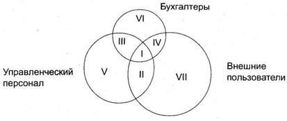 Из приведенной схемы следует, что каждая из групп пользователей имеет собственные интересы; причем только область I отражает совокупность интересов, общих для всех групп. Назначение финансовой отчетности как раз и состоит в том, чтобы в максимально возможной степени сгладить противоречия между интересами различных пользователей.
