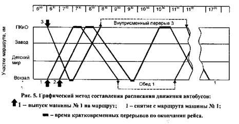Графический метод является удобным способом наглядного отображения графика движения транспортных средств по маршруту. Метод основан на построении графика движения подвижного состава в координатах путь – время (рис. 5). Наклон линий соответствует скорости движения транспортного средства. Выход машин на графике откладывается с учетом установленных интервалов движения в различные периоды суток, обеденных и кратковременных перерывов. Графический метод позволяет «увидеть» необходимость сдвигов выходов машин путем сокращения или увеличения