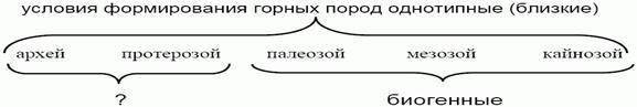 В начале XX в. В.И. Вернадский (1863-1945) обратил внимание естествоиспытателей на то, что горные породы, независимо от времени образования, одинаковые. В архее, протерозое, палеозое, мезозое и кайнозое распространены граниты, кварциты, песчаники. Вызвано это тем, что условия образования минералов и горных пород на Земле во все известное геологическое время были близкими. Если в палеозое, мезозое и кайнозое условия формирования горных пород были достоверно биогенными (в условиях биосферы), то биогенными они были и в архее и протерозое.