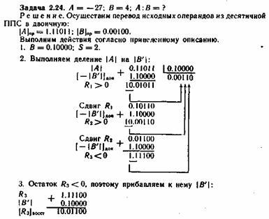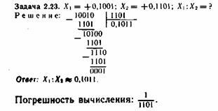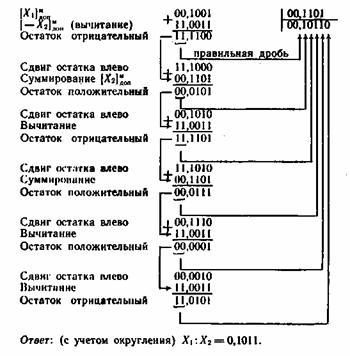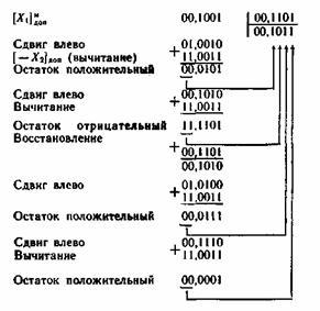 При делении с восстановлением остатка отрицательный остаток восстанавливается суммированием с положительным делителем. Восстановленный остаток сдвигается влево на один разряд. Из сдвинутого остатка вновь вычитается делитель. По знаку полученного остатка определяется цифра очередного разряда частного. Процесс деления продолжается до получения заданного числа цифр частного, обеспечивающего необходимую точность результата.