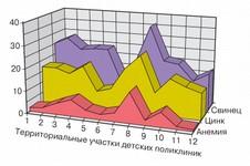 Фрагменты формируемых выходных документов, полученных в ходе автоматизированного медико-экологического мониторинга, показаны на рис. 2—4 (электронные картограммы города с ранжированием зон обслуживания детских поликлиник по уровням заболеваемости и параметрам техногенных нагрузок на среду обитания; математико-статистические и графоаналитические модели, иллюстрирующие возрастание риска заболеваний при ухудшении качества среды обитания).