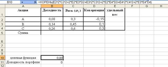 2) Целевая функция (риск портфеля) будет выражаться формулой: