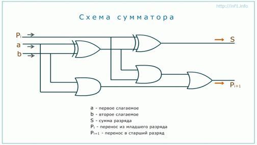Сумматор – логический операционный узел, выполняющий арифметическое сложение кодов двух чисел. Сумматоры классифицируют по системе счисления, одновременно обрабатываемых разрядов складываемых чисел, числу входов и выходов одноразрядных двоичных сумматоров, способу представления и обработки складываемых чисел.