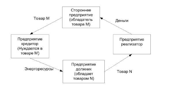 Рассмотрим вариант, когда предприятие-должник не может рассчитаться с предприятием – кредитором, хотя оно произвело товар, который можно реализовать на рынке. Зачет будет заведен на другое предприятие, которое отгрузит продукцию по более приемлемой цене. Затем эта продукция будет реализована за живые деньги. И этими деньгами будет оплачена необходимая кредитору продукция (рис. 2). Здесь и необходимо объединить все стороны, участвующие в зачете в рамках единой схемы.