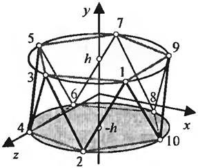 В окружностях сечений цилиндра единичного радиуса строятся правильные пятиугольники 1-3-5-7-9-1 и 2-4-6-8-10-2 с координатами вершин xi