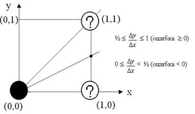 Алгоритм Брезенхема построения растрового образа отрезка был изначально разработан для графопостроителей, но он полностью подходит и для растровых дисплеев. В процессе работы в зависимости от углового коэффициента отрезка изменяется на единицу либо x, либо y, а изменение другой координаты (на ноль или на единицу) зависит от расстояния между действительным положением точки и ближайшей точкой растра, называемое ошибкой. Алгоритм построен так, что анализируется лишь знак этого смещения. На рис. 2 это иллюстрируется для отрезка в первом октанте, то есть для отрезка с угловым коэффициентом, лежащим в диапазоне от нуля до единицы. Из рисунка можно заметить, что если угловой коэффициент отрезка из точки (0, 0) больше чем 1/2, то его пересечение с прямой x = 1 будет расположено ближе к прямой y = 1, чем к прямой y = 0. Следовательно, точка растра (1, 1) лучше аппроксимирует ход отрезка, чем точка (1, 0). Если угловой коэффициент меньше 1/2, то верно обратное. Для углового коэффициента, равного 1/2, нет какого-либо предпочтительного выбора. В данном случае алгоритм выбирает точку (1, 1).