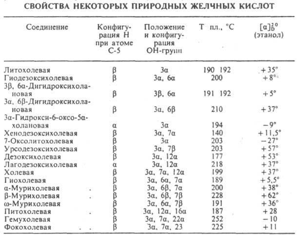 Наиб. распространены ее моно-, ди- и тригидроксизамещенные, содержащие 24 атома С; известны также ди-, три- и тетрагидроксизамещенные желчные кислоты, содержащие 27 (Iб) и 28 (Iв) атомов С. Положение заместителей, расположенных под или над плоскостью молекулы, обозначают соотв. буквами a и b. Желчные кислоты - кристаллы; плохо раств. в воде (см. табл.). Образование желчных кислот происходит гл. обр. в печени нек-рых птиц, млекопитающих и человека из холестерина. Биосинтез желчных кислот из холестерина включает след. р-ции: гидроксилирование по атомам углерода колец В и С, инверсию 3b- в 3a-гидроксигруппу, восстановление двойной связи при атоме С-5 с получением цис-сочленения колец А и В, окислит. отщепление изопропильной группы в боковой цепи с образованием карбоксильной при атоме С-24.