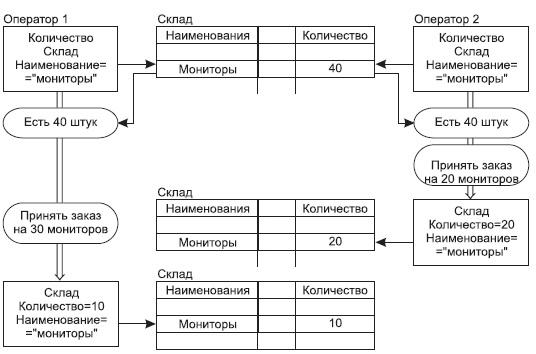 Если с БД работают одновременно несколько пользователей, то обработка транзакций должна рассматриваться с новой точки зрения. В этом случае СУБД должна не только корректно выполнять индивидуальные транзакции и восстанавливать согласованное состояние БД после сбоев, но она призвана обеспечить корректную параллельную работу всех пользователей над одними и теми же данными. По теории каждый пользователь и каждая транзакция должны обладать свойством изолированности, то есть они должны выполняться так, как если бы только один пользователь работал с БД. И средства современных СУБД позволяют изолировать пользователей друг от друга именно таким образом. Однако в этом случае возникают проблемы замедления работы пользователей. Рассмотрим более подробно проблемы, которые возникают при параллельной обработке транзакций. Основные проблемы, которые возникают при параллельном выполнении транзакций, делятся условно на 4 типа: Пропавшие изменения. Эта ситуация может возникать, если две транзакции одновременно изменяют одну и ту же запись в БД. Например, работают два оператора на приеме заказов, первый оператор принял заказ на 30 мониторов. Когда он запрашивал склад, то там числилось 40 мониторов, и он, получив подтверждение от клиента, выставил счет и оформил продажу 30 мониторов из 40. Параллельно с ним работает второй оператор, который принимает заказ на 20 таких же мониторов (ну уж очень хорошая модель и дешево) и, в свою очередь запросив состояние склада и получив исходно ту же цифру 40, он успешно оформляет заказ для своего клиента. Заканчивая работу с данным заказом, он выполняет команду Обновить(UPDATE), которая заносит 20 как остаток любимых мониторов на складе. Но после этого, наконец, любезно попрощавшись со своим клиентом и заверив его в скорейшей доставке заказанных мониторов, заканчивает работу со своим заказом первый оператор и также выполняет команду Обновитьи заносит 10 как остаток тех же мониторов на складе. Каждый из них доволен своей работой, но мы-то знаем, что произошло. Прежде всего, они продали 50 мониторов из наличествующих 40 штук, и далее на складе еще числится 10 подобных мониторов. БД теперь находится в несогласованном состоянии, а у фирмы возникли серьезные проблемы. Изменения, сделанные вторым оператором, были проигнорированы программой выполнения заказа, с которой работал первый оператор. Подобная ситуация представлена на рисунке 1.3.  Рисунок 1.3 - Проблема пропавших обновлений Проблемы промежуточных данных. Рассмотрим ту же проблему одновременной работы двух операторов. Допустим, первый оператор, ведя переговоры со своим заказчиком, ввел заказанные 30 мониторов, но перед окончательным оформлением заказа клиент захотел выяснить еще некоторые характеристики товара. Приложение, с которым работает первый оператор, уже изменило остаток мониторов на складе, и там сейчас находится информация о 10 оставшихся мониторах. В это время второй оператор пытается принять заказ от своего клиента на 20 мониторов, но его приложение показывает, что на складе осталось всего 10 мониторов, и оператор вынужден отказать выгодному клиенту, который идет в другую фирму, весьма неудовлетворенный работой нашей компании. А в этот момент клиент оператора 1 заканчивает обсуждение дополнительных характеристик наших мониторов и принимает весьма н