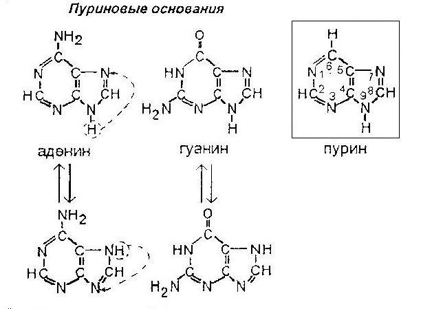 В пурине, аденине и гуанине происходит миграция водорода между N-7 и N-9. Для гуанина также имеет место лактим-лактамная таутомерия. Оксоформа более устойчива при физиологических значениях pH.