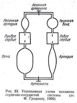Значительную роль в организации сердечно-сосудистой системы играет механическая модель, которая хорошо демонстрирует взаимосвязь артериального давления и минутного объема сердца (рис. 33). Закономерности функционирования этой механической модели указывают на двусторонний характер связи между давлением в сосудах и минутным объемом сердца.