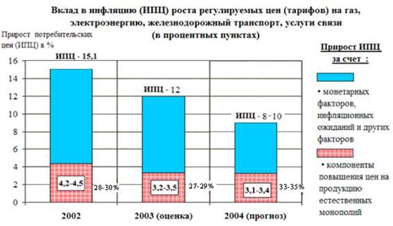 Тщательные исследования, связанные с изучением факторов, влияющих на динамику инфляции в России, убедительно свидетельствуют, что вклад естественных монополий в рост инфляции составляет не более 10%. То есть, если у нас инфляция составила 12%, значит 1,2% дали естественные монополии, а остальные 10% роста инфляции - это, так называемая фоновая инфляция, создаваемая действиями родного Центробанка [11].