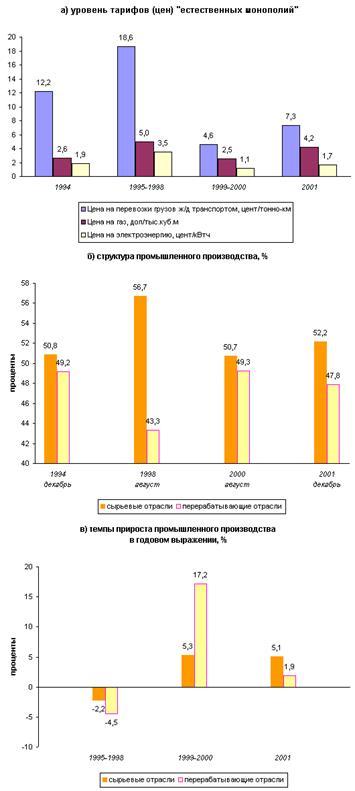 Высокие тарифы в 1995-1998 годов способствовали более быстрому сокращению производства в перерабатывающих отраслях промышленности (в среднем в год на 4,5%) по сравнению с сырьевыми (на 2,2%). В том числе из-за роста тарифов доля перерабатывающих отраслей во всем промышленном производстве сократилась с 49,1 до 43,1%, а доля сырьевых отраслей соответственно возросла с 50,9 до 56,9%.