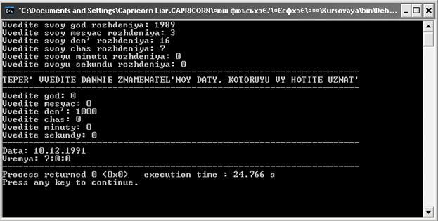 Ввод данных закончен. Теперь программа рассчитывает знаменательную дату, исходя из введенных пользователем данных и выводит дату и время на экран. Например: