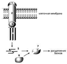 Сигнальная молекула (1) связывается с “рецептором смерти” (2) и далее через адаптерный белок (3) - с прокаспазой-8 (4), после чего она превращается в активный фермент каспазу-8 (5). Она активирует в свою очередь прокаспазу-3 (6), которая, став действующим ферментом (7), расщепляет клеточные белки, и клетка погибает.